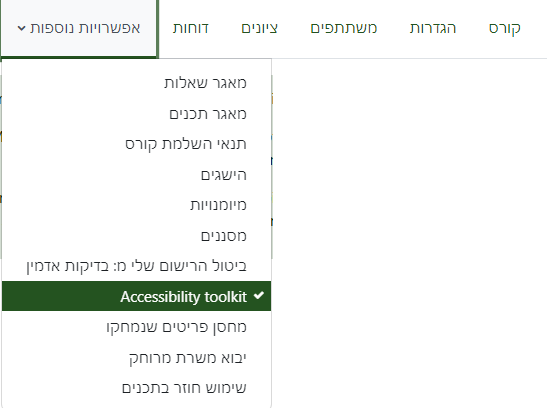 - בתפריט הקורס בחירה בלשונית "אפשרויות נוספות" ואחר בחריה ב: "Accessibility toolkit"