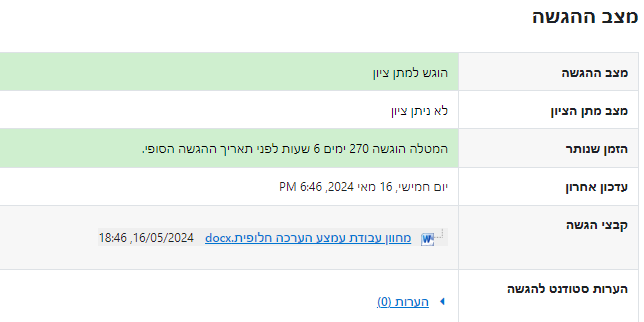 בחלון מצב ההגשה יופיע הקובץ והסטטוס של הבדיקה, האם ניתן ציון, כמה זמן לפני המועד הסופי המטלה הוגשה ועוד.