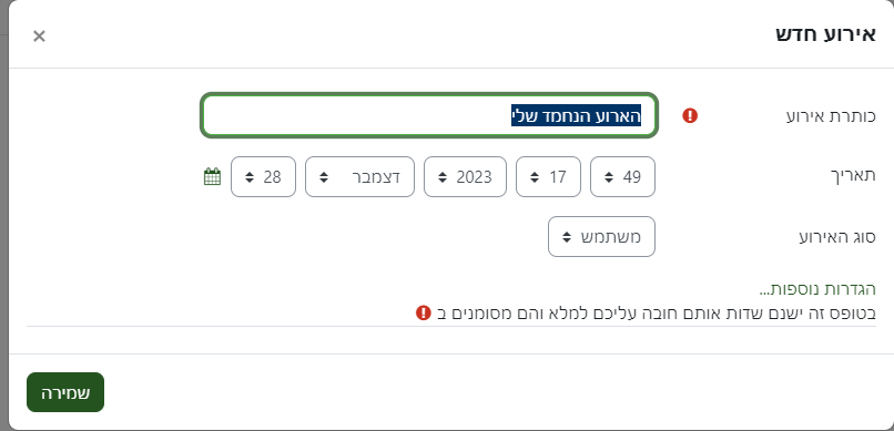 - כתוצאה מבך נפתח חלון "ארוע חדש.