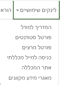 - לינקים שימושיים: מכילה קישורים חשובים בינהם: המדריך למודל, פורטל הסטודנטים, כניסה למייל המכללתי ועוד.