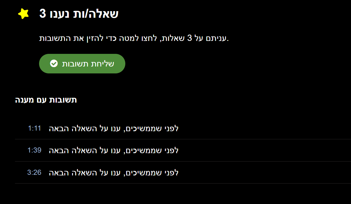 - בחלק הימני של ציר הזמן מופיע כפתור בצורת כוכב. לאחר שמסיימים את כל השאלות יש ללחוץ על כפתור הכוכב. כתוצאה מכך יפתח מסח ובו הסיכום של כל השאלות שנענו.