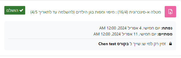 מטלה היא אחד הכלים העקריים להערכת תלמיד. התלמיד יוכל להגיש את המטלה בחלונית טקסט במודל ו\או כקובץ ו\או בקבוצה בהתאם להגדרות המרצה.