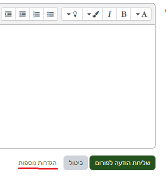 במידה רוצים להוסיף קובץ לדיון יש ללחוץ על הקישור "הגדרות נוספות" בתחתית עורך המלל.