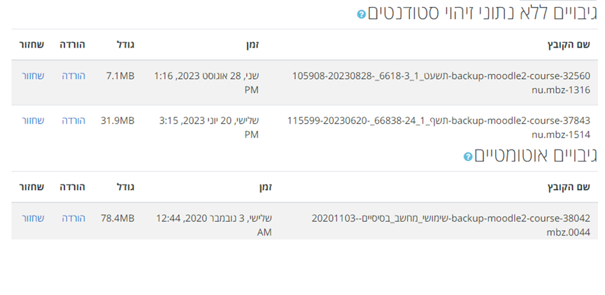 - גיבויים ללא נתוני זיהוי סטודנטים: גיבויים שהמרצים עצמם עשו לצורך העברת הקורס למודל אחר.