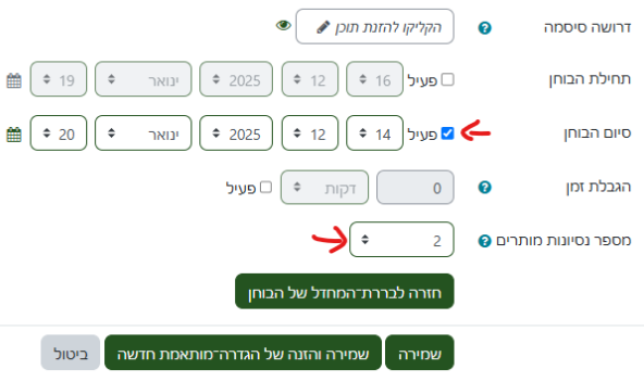 - במנגנון תוספת הזמן (הגדרות מותאמות) יש להגדיר לסטודנט גם תוספת זמן וגם ניסיון מענה נוסף (למרות שהוא עדיין לא הגיש אפילו פעם אחת)