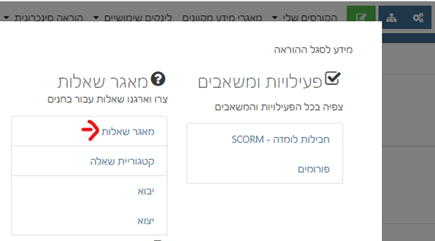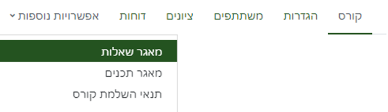 מודל 4 – בתפריטי הקורס בחירה ב"אפשרויות נוספות" ואחר "מאגר שאלות".