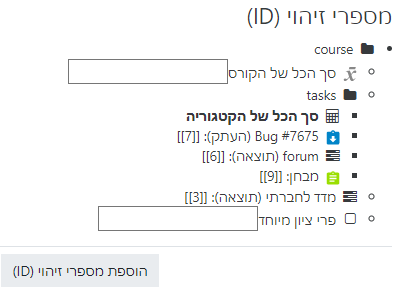 בחלון פריט ציון יש לתת לכל פריט מספר מזהה (בחלוניות) ואחר ללחוץ על: "הוספת מספרי זיהוי".