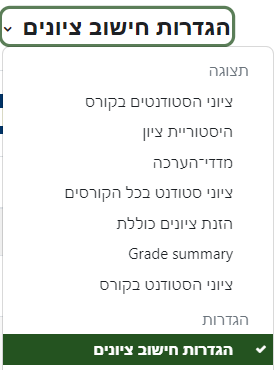 הגדרות חישוב ציונים, הגדרות תצוגת דוחות ציונים, העדפות: ציוני הסטודנטים בקורס. שתי הלשוניות האחרונות מתמקדות באופן שבו הציונים יוצגו.