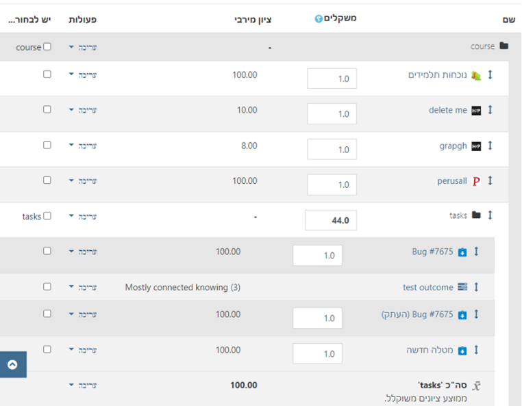 פריט ציון: בעזרת פריט ציון ניתן לשקלל את הציון של מספר פעילויות. לכל קטגוריה יש פריט ציון מסכם, וכן פריט ציון מסכם לקורס.