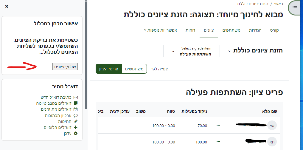 • יש ללחוץ על כפתור "שלח\י ציונים" כדי לסנכרן את הציונים עם הפורטל.