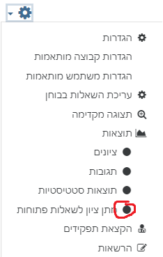 כדי לבדוק שאלת מאמר יש להיכנס למבחן עצמו, לבחור בתפריט גלגל השיניים ואחר מתן ציון לשאלות פתוחות