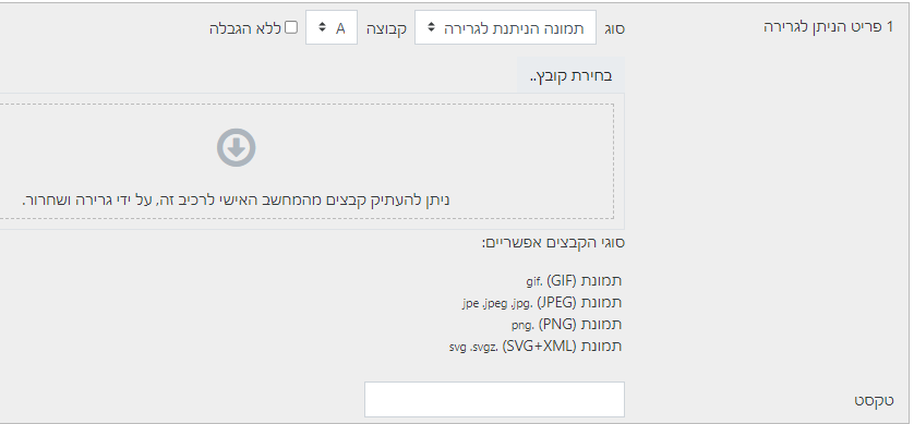 באזור "פריטים הניתנים לגרירה" - מעלים את התמונות שאותן ניתן לגרור. לחלופין ניתן לכתוב טקסט כתחליף לתמונה. יש לבחור מהתפריט מה ניתן לגרור תמונה או טקסט.