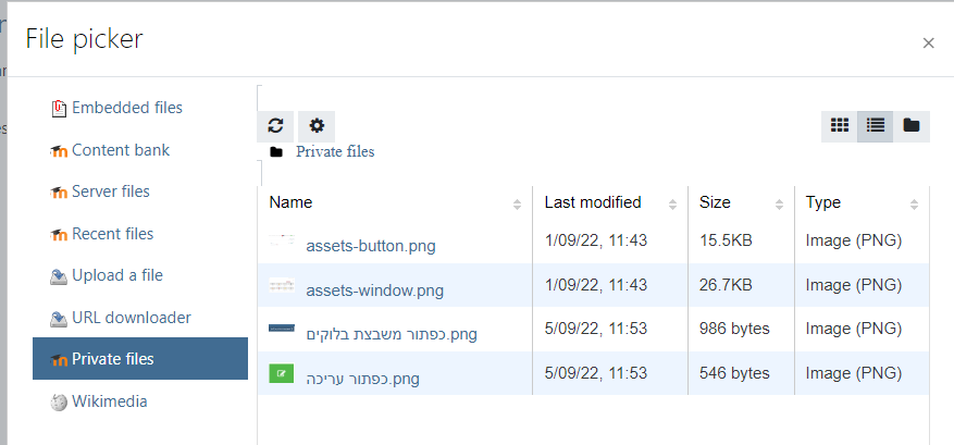 • יפתח חלון  בחירת קובץ (File Picker) ניתן לבחור את הקובץ ממספר מקורות (קבצים שהועלו לאחרונה, לינק משרת, מתיקיית הקבצים שלי במודל או להעלות מהמחשב)