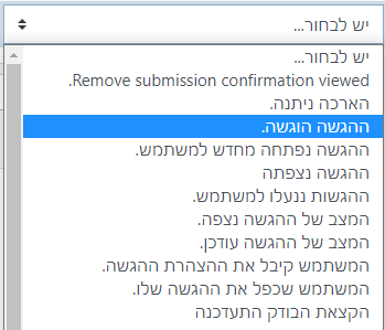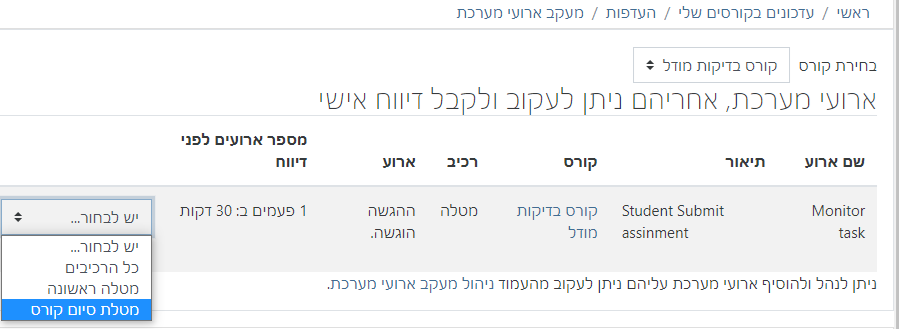 בתפריט אירוע יש לבחור את האירוע הספציפי. לדוגמה עם הרכיב הנבחר הוא מטלה האירוע יכול להיות: הגשה הוגשה, ההגשות ננעלו למשתמש, ההגשה נפתחה מחדש למשתמש ועוד.