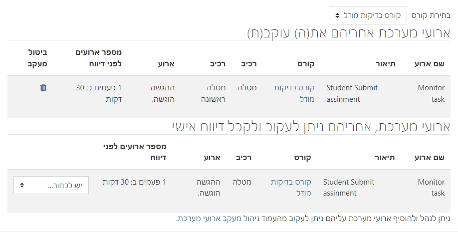 בתפריט השמאלי ניתן לבחור לאיזה רכיב להתייחס (במקרה זה "מטלה ראשונה", "מטלת סיום קורס" או כלל המטלות. לאחר בחירת הרכיב יופיע מעקב אירוע.