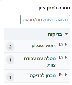 במשבצת מופיעה רשימת הפעילויות (מטלה\ מבחן) שבהם נדרשת בדיקת המרצה. מול שם הפעילות מופיע מספר התלמידים שעדיין לא ניתן להם ציון. לחיצה על שם הפעילות תביא אותנו למבחן או המטלה שבה יש לתת את הציון.