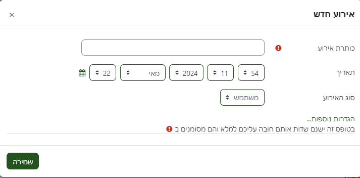 - בקורס: במקרה זה ירוכזו התאריכים של אירועי הקורס: