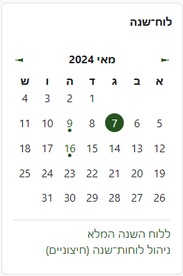 - בחלקו העליון של לוח השנה מוצג החודש הנוכחי. ניתן לעבור לחודש הקודם\ הבא על ידי חיצים.