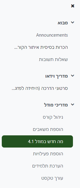 כאשר נמצאים בתוך קורס (לא משנה אם בחלון הראשי, בהגדרות, ציונים או בפעילות ספציפית), נוסף בצד הימני העליון כפתור "מגירת הניווט". ![]()