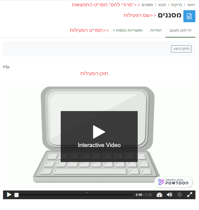 מתחת לתפריט יופיע שם הפעילות, מתחתיו תפריט הפעילות, ולבסוף התוכן.