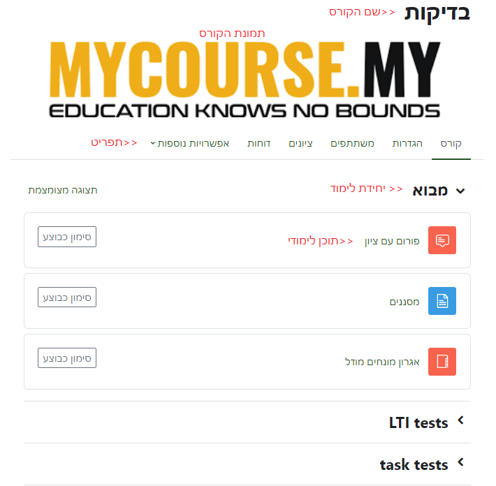 במידה ופותחים יחידת תוכן לימודי (פעילות) באזור הקורס יופיע אזור תוכן הפעילות (התוכן של האזור ישתנה על פי הפעילות עצמה)