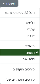 בחלק המרכזי של תפריט הסינון מופיעות האפשרויות: תשפ"ד, תשפה. תפריט סינון זה בנוי על סמך הגדרת הקורס בשדה "שנה".