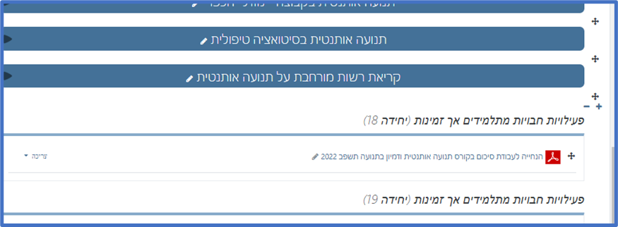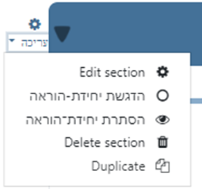 הסתרת יחידת הוראה נעשית באופן דומה להסתרת פעילות. לחיצה על תפריט עריכה טאחר בחירה ב"הסתרת יחידת הוראה".