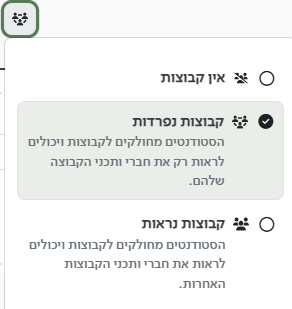 לחיצה על אייקון הקבוצה, ובאין קבוצה מעבר באזור הקבוצה ולחיצה (רק לפעילויות שיש להן אפשרות של חלוקה לקבוצות) יפתח תפריט קיצור ובו אפשרויות לבחור את מצב הקבוצה: אין קבוצות, קבוצות נפרדות, קבוצות נראות.