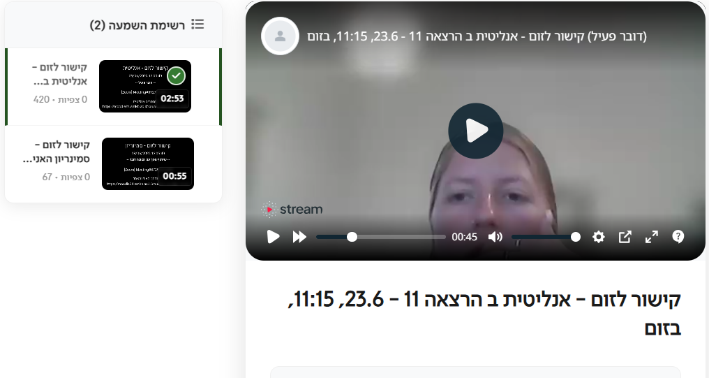 - מצד ימין חלון הצפיה, משמאל רשימת ההקלטות. במידה והמשתמש צפה בהקלטה יופיע עליה סימן V ירוק.