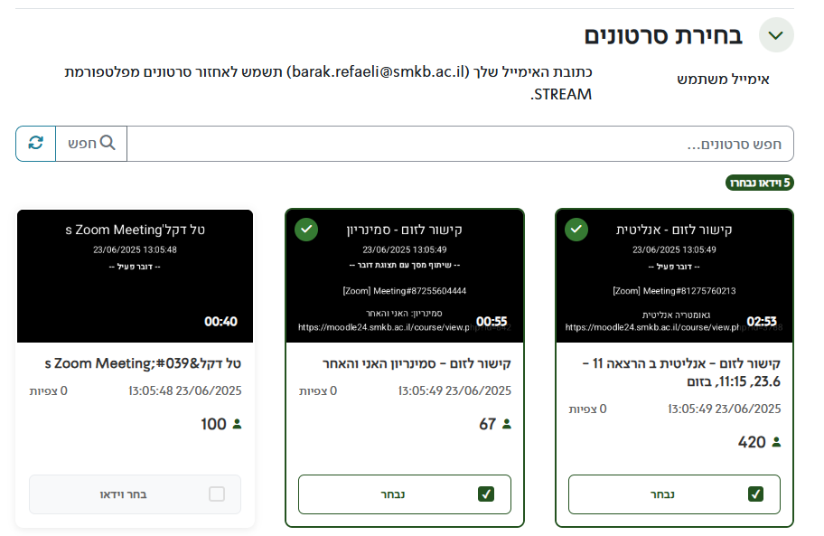 - באזור "בחירת סרטונים" בחירת ההקלטות הרצויות על ידי סימון תיבת בחירה מתחת לכל הקלטה רצויה.