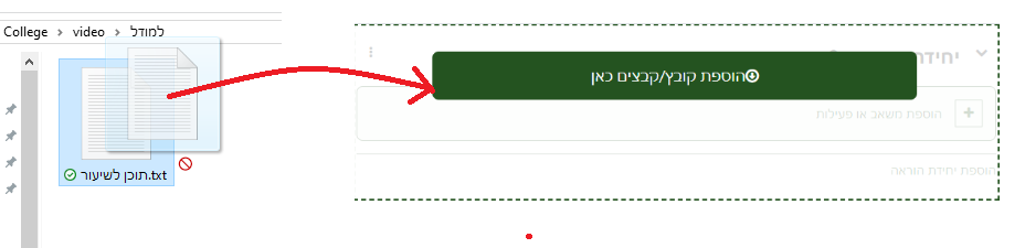 כדי להעלות קובץ יש לגרור את הקובץ מהתיקיה במחשב למקום המתאים בקורס: