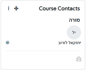 בלוק המציג את שם המרצים בקורס. ניתן לשלוח למרצה דוא"ל דרך אייקון המעטפה, או ללחוץ על אייקון התמונה של המרצה (במקרה ואין תמונה ראשי התיבות של השם בתוך עיגול, כדי להגיע לעמוד הפרופיל של המרצה.