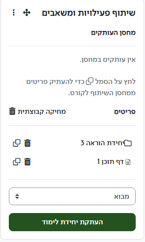 בלוק שנועד להקל העברת פעילויות ומשאבים מקורס לקורס. הבלוק היה קיים גם בעבר, אבל נוספה לו היכולת להעתיק יחידות לימוד שלמות.