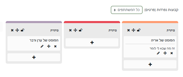 לאחר יצירת פריט חדש יפתח חלונית שבה ניתן להוסיף נושא פרסום, תוכן טקסטואלי, סרט, תמונה או קישור.