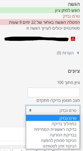 בחלון בדיקת ההגשה באזור "מצב נגנון בדיקה בשלבים", בחורים את הסטטוס הרצוי: טרם נבדק, בתהליך בדיקה, בדיקה ראשונית הסתיימה, בבדיקת המרצה, ממתין להפצה, זמין לסטודנט.