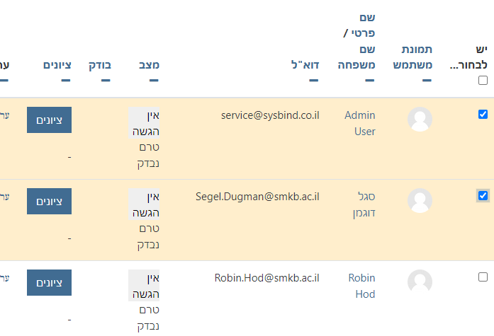- בטבלת ההגשות מסמנים (בתיבת הסימון) את הסטודנטים להם רוצים לשנות את הסטטוס