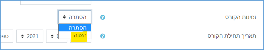 • ב'זמינות הקורס' יש לבחור 'הצגה':
