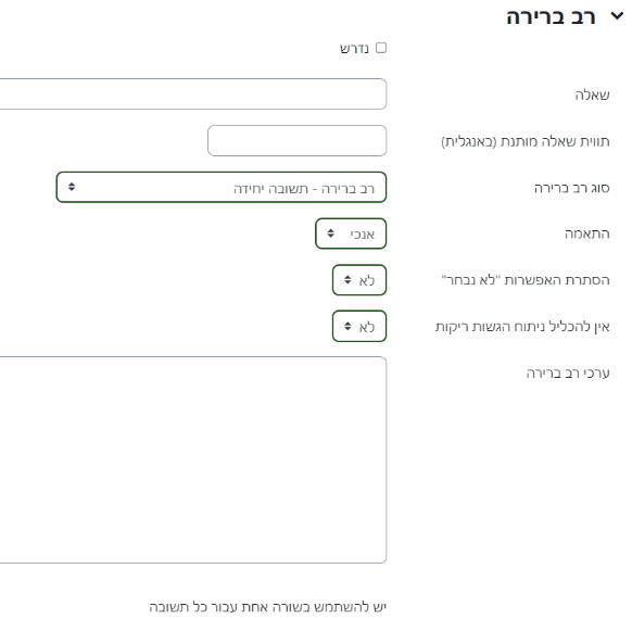 - סוג רב ברירה: תשובה יחידה, תשובות מרובות, תשובה מתוך תפריט.