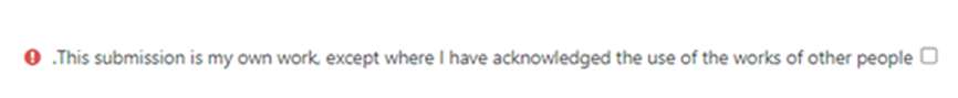 הצהרת הגשה. בבחירת אפשרות זו תוצג הודעה שבה התלמיד מצהיר שהוא ביצע את העבודה בעצמו. לצד ההודעה Checkbox שבה התלמיד מאשר את ההצהרה.