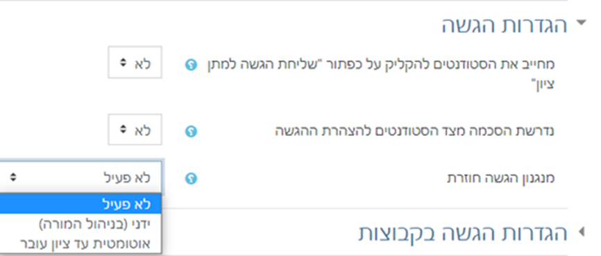 • ידני: המרצה יאפשר באופן ידני לתלמיד מסוים להגיש שוב את העבודה.