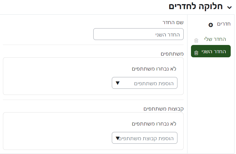 • באזור המשתתפים מוספים משתתפים לכל חדר. ניתן להוסיף משתתפים באופן פרטני בתפקיט "הוספת משתתפים", או על פי קבוצות בתפריט "הוספת קבוצת משתתפים.