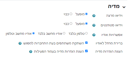 • הצגת הגדרות מדיה: תציג את המידעים הבאים: התחלת וידאו בעת הצטרפות המרצה, התחלת וידאו בעת הצטרפות סטודנטים, אפשרויות אודיו, השתקת משתתפים בעת התחברות
