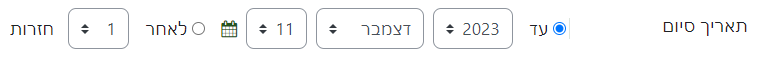• תאריך סיום: תאריך הסיום של הקורס - מתאריך זה והלאה כבר לא תתקיים הפגיה החוזרת. במקום לקבוע את תאריך הסיום ניתן  לקבוע כמה מפגשים חוזרים יהיו.
