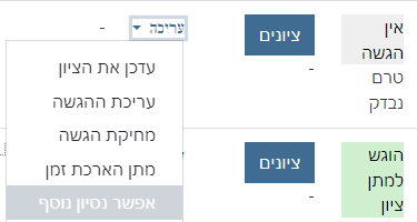 - כאשר נבחר מנגנון ידני, בדף "הצגת\ מתן ציונים להגשות", בתפריט עריכה מול שם הנבחן תופיע האפשרות: אפשר ניסיון נוסף