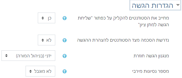 - מנגנון הגשה חוזרת: מאפשרת לסטודנטים להגיש את המטלה מספר פעמים. ישנם שלוש אפשרויות: