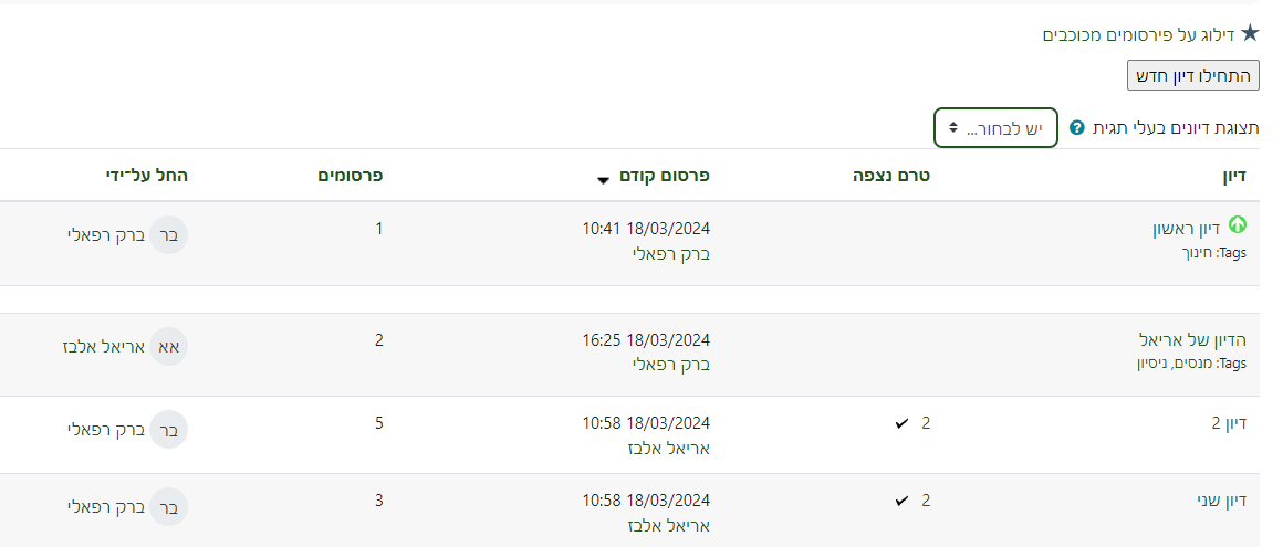 - במידה וחלק והוספו לחלק מהפוסטים תגיות יופיע תפריט "תצוגת דיונים בעלי תגית", ומהתפריט ניתן לבחור את אחת התגיות. על פי התגית הנבחרת יופיעו רק פוסטים שהוספה להם התגית הנבחרת.