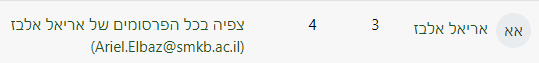 - צפיה בפרסומי המשתמשים + מתן ציון: לחיצה על כפתור זה תפתח חלון "פרסומי משתמש, שבו ניתן לתת ציון לכל משתמש, וכן לצפות במרוכז בכל הפרסומים שמשתמש מסויים העלה (פירוט בהמשך).
