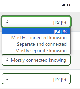 - במידה והוחלט שהציון ינתן באופן ידני על ידי המרצה יופיע תפריט למתן ציון. במידה והציון הוא ערך מספרי בתפריט יוצגו מספרים מאחד עד 100. במידה והוחלט על מדרגות הערכה בתפריט יוצגו מדרגות הערכה שנבחרו.