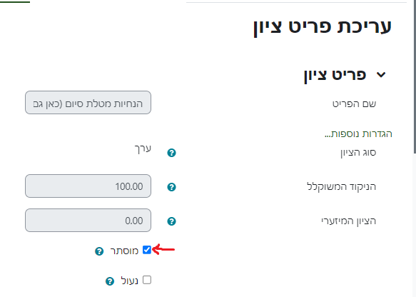 - הציונים של הפריט הנבחר יוסתרו עד שהמרצה יבטל את ההסתרה.