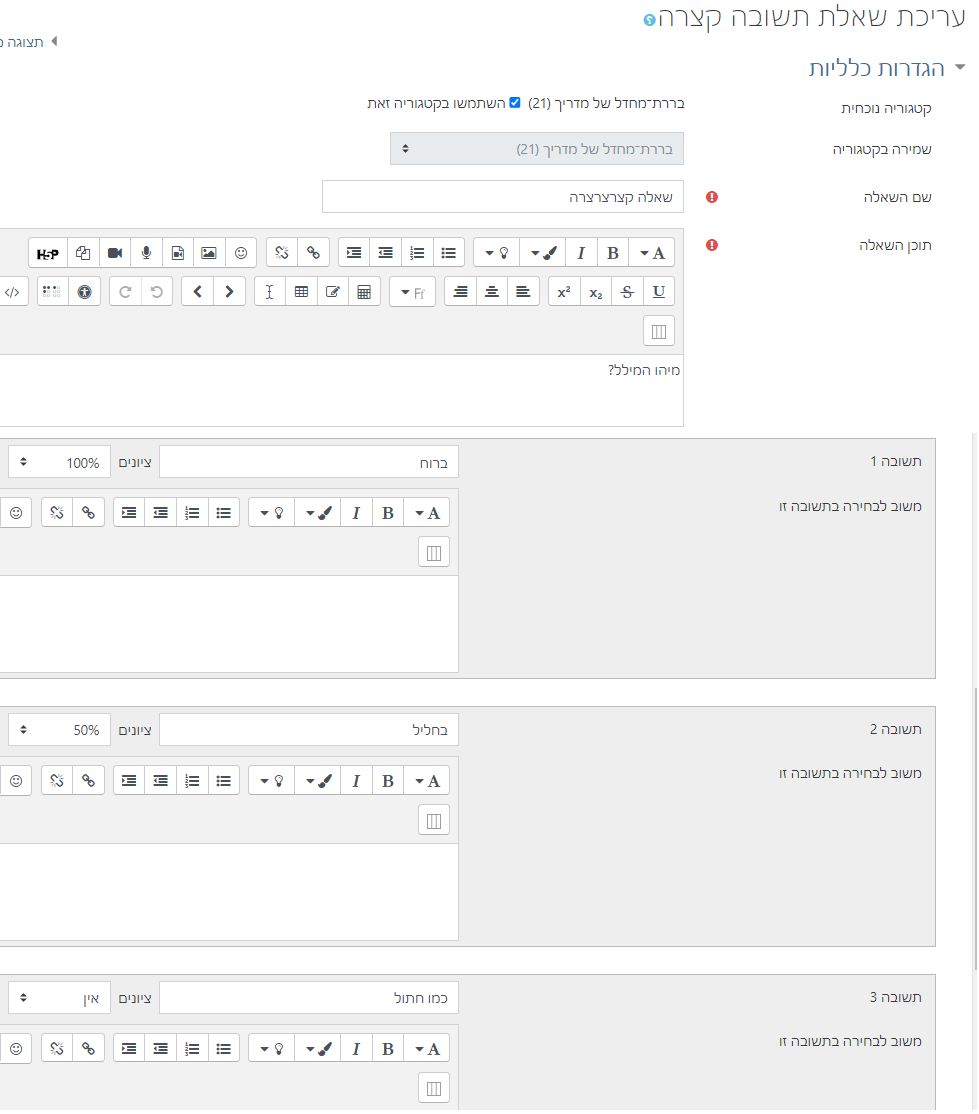חשוב: המערכת סורקת את התשובות מהתשובה הראשונה להאחרונה. לכן חשוב למקם בראשונה את התשובות הנכונות שנותנות 100 אחוז מהציון ורק אחר כך בסדר יורד את התשובות החצי נכונות.